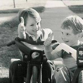 Kasey rides his big-wheel so fast he burns a hole in one of the plastic tires.
